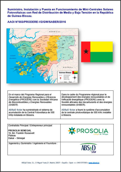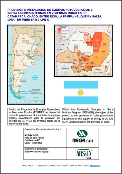 SABER – NIGER (PDF 600kb) Forniture, Installation et Mise en Service de Systèmes Solaires Photovoltaïques au Níger SABER – MALI (PDF 600kb) Projet d´Electrification de Huit (8) Localites du Mali par des Kits Solaires Photovoltaïques PERMER – ARGENTINA (PDF 980kb) Fourniture des Équipements Solaires Photovoltaïques en CC et CA (Province de Salta) Link YouTube Vidéo ABS 22-6 Wi-fi Lampadaires avec connexion Wi-Fi SABER – Guinea-Bissau (PDF 1800kb) Fourniture de batteries 36.000 Ah